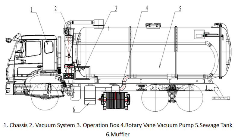 ● اجزای اصلی کامیون مخزن فاضلاب Howo شامل یک محور قدرت (PTO)، شفت درایو، پمپ خلاء، مخزن فشار، سیستم هیدرولیک، سیستم لوله کشی، گیج خلاء، شیشه دید و دستگاه شستشوی دست است.