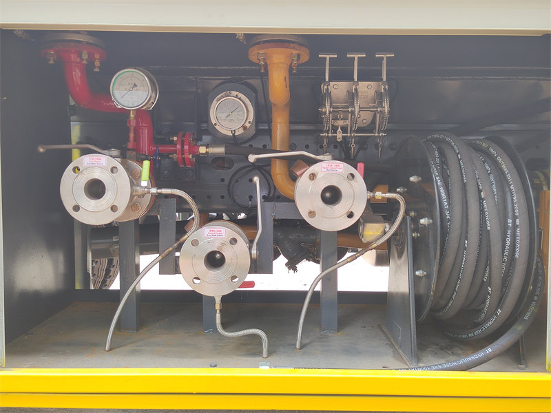 اتصالات مخزن: کامیون سوخت گیری HOWO LPG مجهز به سیستم پر کردن کامل شامل پمپ، فلومتر، قرقره شلنگ و شیر قطع اضطراری به همراه لوازم جانبی ایمنی ضروری مانند گیج سطح، دماسنج، فشارسنج و شیر اطمینان است.