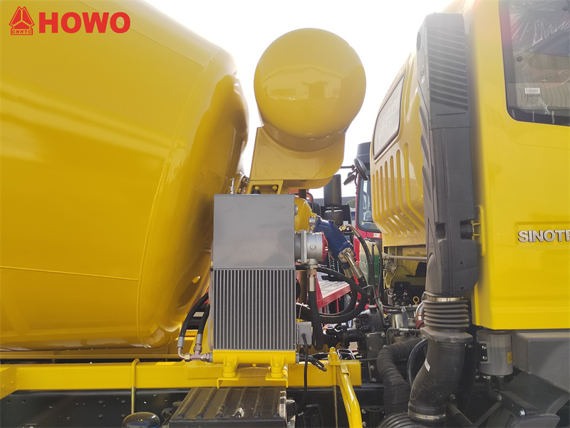 کامیون میکسر بتن HOWO 5 متر مکعبی، از کابین ردیف و نیم کابین HOWO 2080 با جرم کل 16 تن و فاصله بین دو محور 3800 میلیمتر استفاده میکند. این کامیون به موتور SINOTRUK MC05.18-40 با قدرت 180 اسب بخار و گیربکس 10 سرعته HW90510C مجهز شده است. مخزن مخلوطکن بالایی دارای ظرفیت 5 متر مکعب است و از فولاد منگنزی Q355 ساخته شده است. بدنه مخزن 4 میلیمتر و سر آن 6 میلیمتر است. این کامیون به کاهنده سرعت، پمپ و موتور هیدرولیک، رادیاتور، مجموعه جعبه کنترل هوا، ظرفیت مخزن آب 400 لیتر، منبع تغذیه آب با فشار هوا، دستههای کنترل دو طرفه در انتهای کامیون، عملکرد اتصال و میزان پسماند کم مجهز شده است.