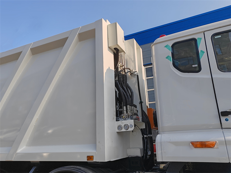 ظرف زباله: سازه بالایی دارای یک مخزن زباله فشرده قوسی شکل به حجم 30 متر مکعب است که از فولاد کربنی با استحکام بالا ساخته شده و با مواد ضد خوردگی و زنگ زدگی پوشش داده شده است، با صفحات جانبی به ضخامت 5 میلی متر و یک صفحه پایینی به ضخامت 6 میلی متر.