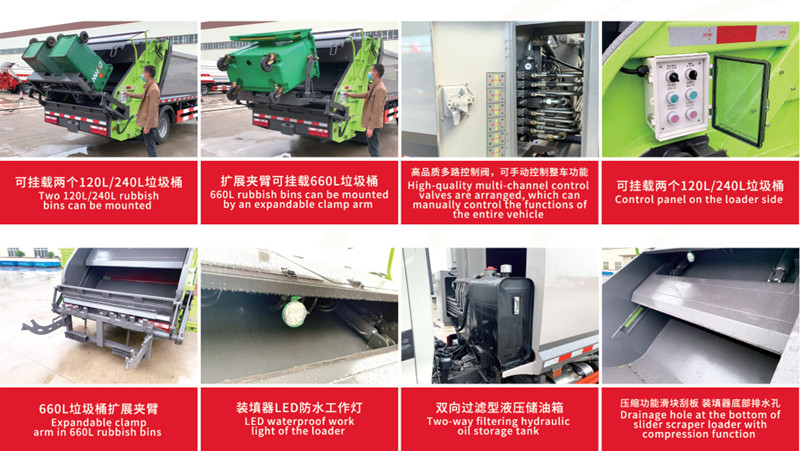 PLC control systemلودر عقب بازیافت زامبیا هوو با ظرفیت ۱۵ متر مکعب در ساعت از یک سیستم هیدرولیک برای به حرکت درآوردن یک دستگاه فشردهسازی استفاده میکند که زبالههای سست را با قدرت فشرده میکند تا حجم آنها را کاهش داده و ظرفیت بارگیری را به میزان قابل توجهی افزایش دهد. این وسیله نقلیه به یک جعبه بار مهر و موم شده مجهز شده است تا از نشت و انتشار بو جلوگیری شود و از آلودگی ثانویه جلوگیری شود.