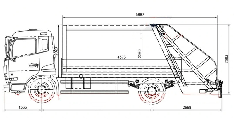 ●این وسیله نقلیه در قسمت عقب به مکانیزم کج شدن مجهز است که به طور خودکار سطلهای زباله یا مخزنها را کج میکند و زبالهها را به محفظه فشردهسازی میفرستد. هلدهندههای هیدرولیکی زباله را چندین بار فشرده میکنند و حجم آن را به حدود یک سوم اندازه اولیهاش کاهش میدهند و ظرفیت بارگیری را به میزان قابل توجهی افزایش میدهند.